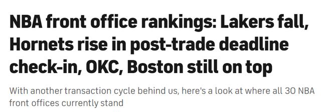 北京時間2月18日,知名美媒CBS對聯盟30隊的管理層進行了排名,其中雷霆管理層居首,凱爾特人第2,火箭第3,騎士第5,勇士第17,湖人第25,國王墊底。具體排名如下: