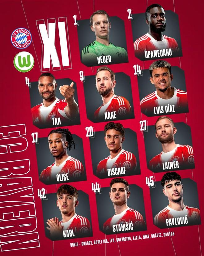 拜仁首發:1-諾伊爾、27-萊默爾、2-于帕梅卡諾、4-約納坦-塔、44-斯塔尼希奇、20-比朔夫、45-帕夫洛維奇、14-迪亞斯、17-奧利塞、42-卡爾、9-凱恩