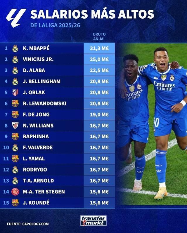北京時(shí)間1月23日,德國(guó)轉(zhuǎn)會(huì)市場(chǎng)官方列出了西甲球員稅后年薪榜排名,其中皇馬球員包攬前四,奧布拉克第五。