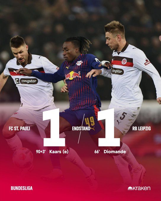 北京時間1月28日03:30,德甲聯賽第16輪,圣保利在主場米勒門球場迎戰RB萊比錫。上半場雙方均無建樹,半場0-0結束。易邊再戰,第66分鐘,揚-迪奧曼德破門為RB萊比錫取得領先;補時階段,勞姆送點,卡爾斯主罰點球命中,幫助圣保利扳平比分。最終雙方1比1戰平。