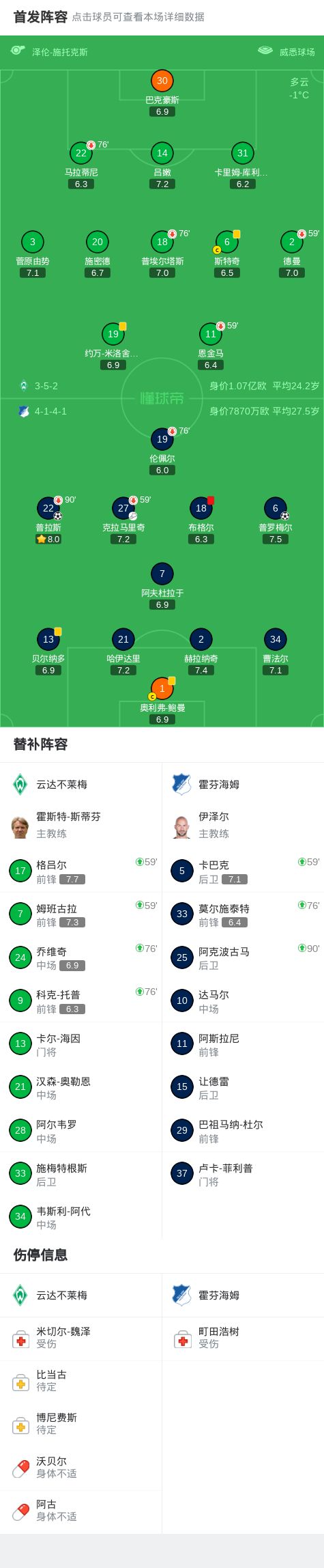 - 2026年01月28日 德甲-普拉斯破門普勒梅爾建功 十人霍芬海姆客場2-0不萊梅