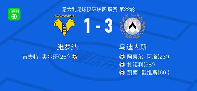 北京時間1月27日,意大利足球頂級聯賽第22輪,維羅納主場對陣烏迪內斯。烏迪內斯率先由阿蒂爾-阿塔破門得分,隨后維羅納由吉夫特-奧爾班扳回一球。上半場結束前,烏迪內斯再度取得進球,扎諾利將比分超出。下半場,阿蒂爾-阿塔送出助攻,凱南-戴維斯破門得手。最終,維羅納1–3不敵烏迪內斯。