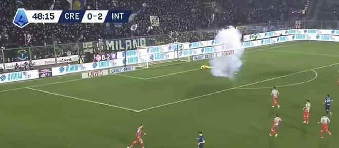 比賽第49分鐘,國際米蘭左路迪馬爾科持球準備進攻,突然一片煙霧出現在屏幕上方,克雷莫內塞門將奧代羅痛苦到底。當時狗哥和所有國米球迷的想法應該是一樣的——要壞,這邊兒看臺可都是國米球迷,一旦奧代羅受傷嚴重,極有可能比賽會被立即終止,這對于一直掌控比賽的國際米蘭來說,徒增變數,絕對不是好事。