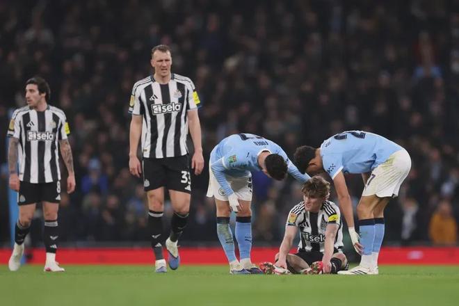 戈登離場(chǎng)時(shí),紐卡斯?fàn)栐趫?chǎng)上以0-3落后曼城。曼城上半場(chǎng)憑借馬爾穆什的梅開二度和賴因德斯的進(jìn)球取得三球領(lǐng)先,將總比分優(yōu)勢(shì)擴(kuò)大到5-0。盡管埃蘭加為客隊(duì)扳回一城,但對(duì)最終結(jié)果影響甚微,曼城以5-1的總比分晉級(jí)。