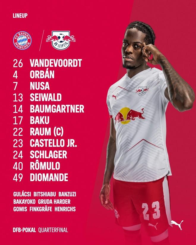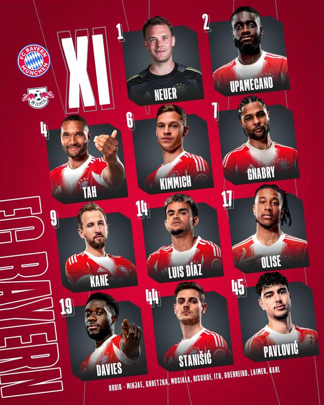 北京時間2月12日凌晨3點45分,德國杯1/4決賽展開一場焦點戰役,拜仁對陣萊比錫。賽前,雙方公布首發陣容。