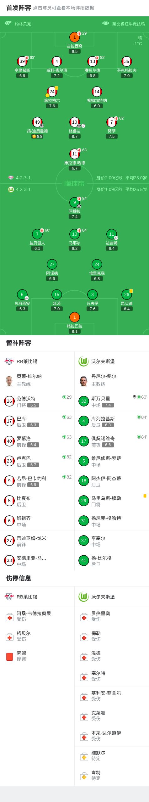 第70分鐘,格拉巴拉開球失誤,格魯達助攻迪奧曼德破門,萊比錫1-1沃爾夫斯堡