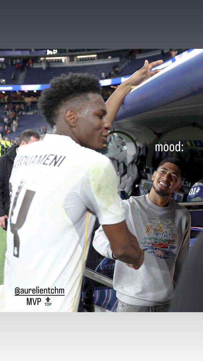 賽后,貝林厄姆在自己的社交媒體上分享了一張自己與楚阿梅尼握手的照片,并在圖中寫道MVP,然后自己臉上方則寫著自己的心情就像這樣。